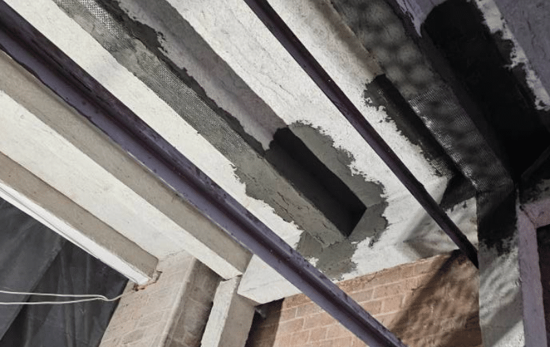 Zaprojektowano systemowe wzmocnienie empory z użyciem technologii FRCM, polegającej na klejeniu siatek węglowych C-MESH 84/84 oraz C-MESH 182 do konstrukcji z zastosowaniem nieorganicznej matrycy MX-C 50 Concrete. Wzmocniono zarówno górną, jak i dolną powierzchnię stropu, żebra oraz podciągi, a także słupy wsporcze. Dodatkowo przewidziano wykonanie 3-centymetrowej warstwy nadbetonu PCC z zaprawy MONOLITH EB2 54Z, na oczyszczonym podłożu pokrytym warstwą sczepną MONOLITH MK 54Z.